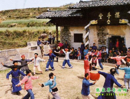 “擺手”,土家語稱為“舍巴”。原為“男女齊集歌舞,祓除不祥”的帶有原始宗教性質(zhì)的集體舞蹈。過去多在農(nóng)歷正月初六至十五日晚餐之后舉行。屆時(shí),人們聚集擺手堂前,先舉行祭祀儀式,然后敲鑼打鼓,鳴放鞭炮,眾人圍圈而舞,盡情歡跳。具體方式,人數(shù)不限。由一人在圈中司鼓鳴鑼,男女舞眾圍成圓圈,隨鼓點(diǎn)進(jìn)退,變換舞姿。一般手與腳成順向同時(shí)動作,兩人一組,面面相對,踢踏擺手,翩躚進(jìn)退,扭腰旋轉(zhuǎn),矯健有力。套式和內(nèi)容多種多樣。每舞一周或數(shù)周換一套程式,表現(xiàn)征戰(zhàn)、狩獵、勞動和日常生活等不同內(nèi)容。